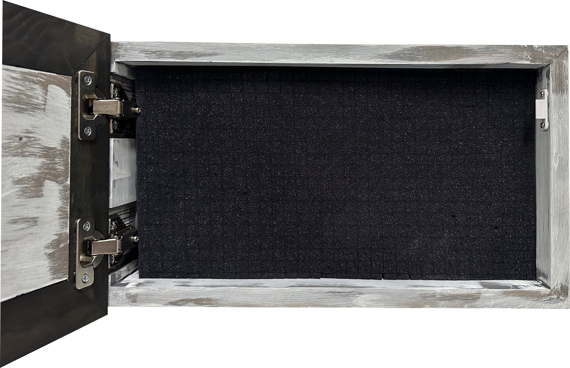 - Wall-Mounted Secured Gun Safe with black frame and distressed finished inset and box with engraved and hand-painted "Bless This Home and all who enter" design.