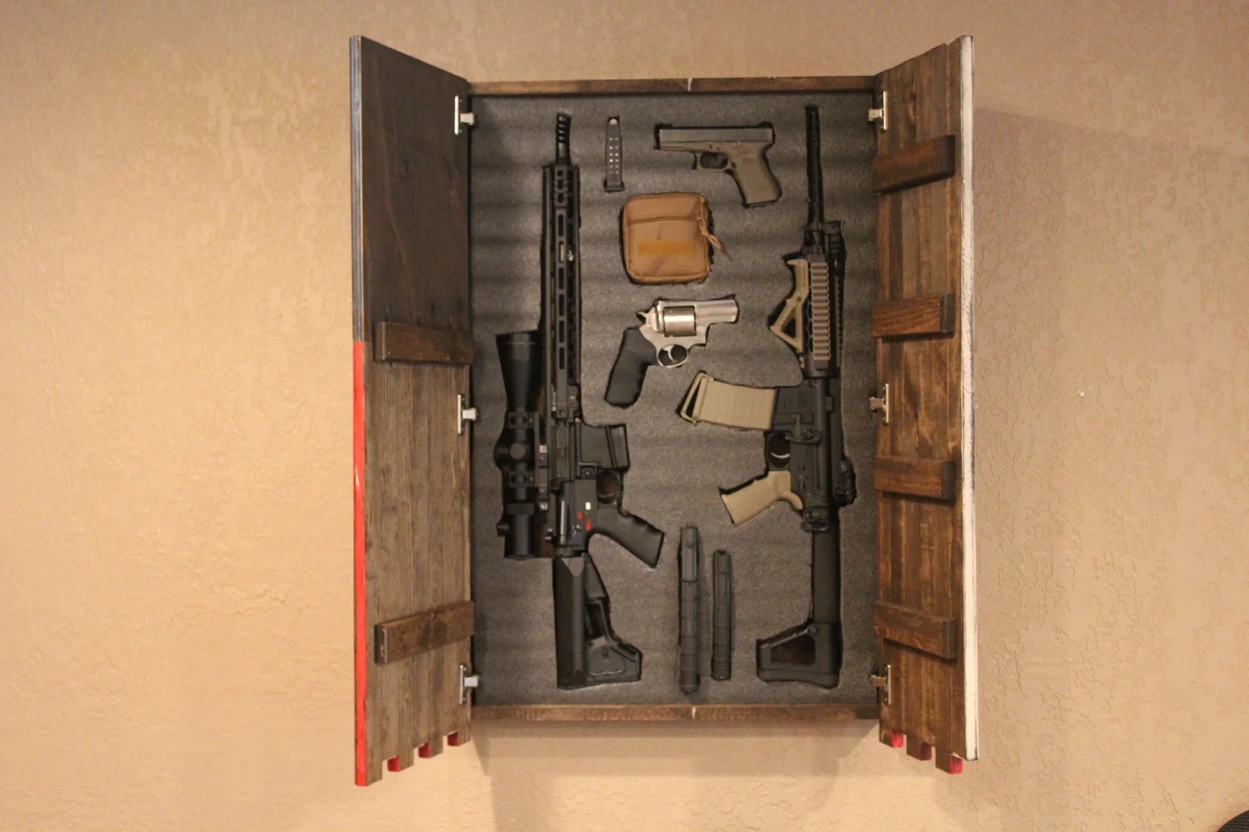 Liberty Home Concealments vertical American flag gun case features two doors that open to reveal a spacious 36” by 23” compartment, lined with Kaizen closed-cell foam that can be easily customized to fit any item you want to store. Liberty Home Concealments vertical flag comes with a magnetic safety lock, however, we do offer you the option to upgrade to a digital RFID lock.