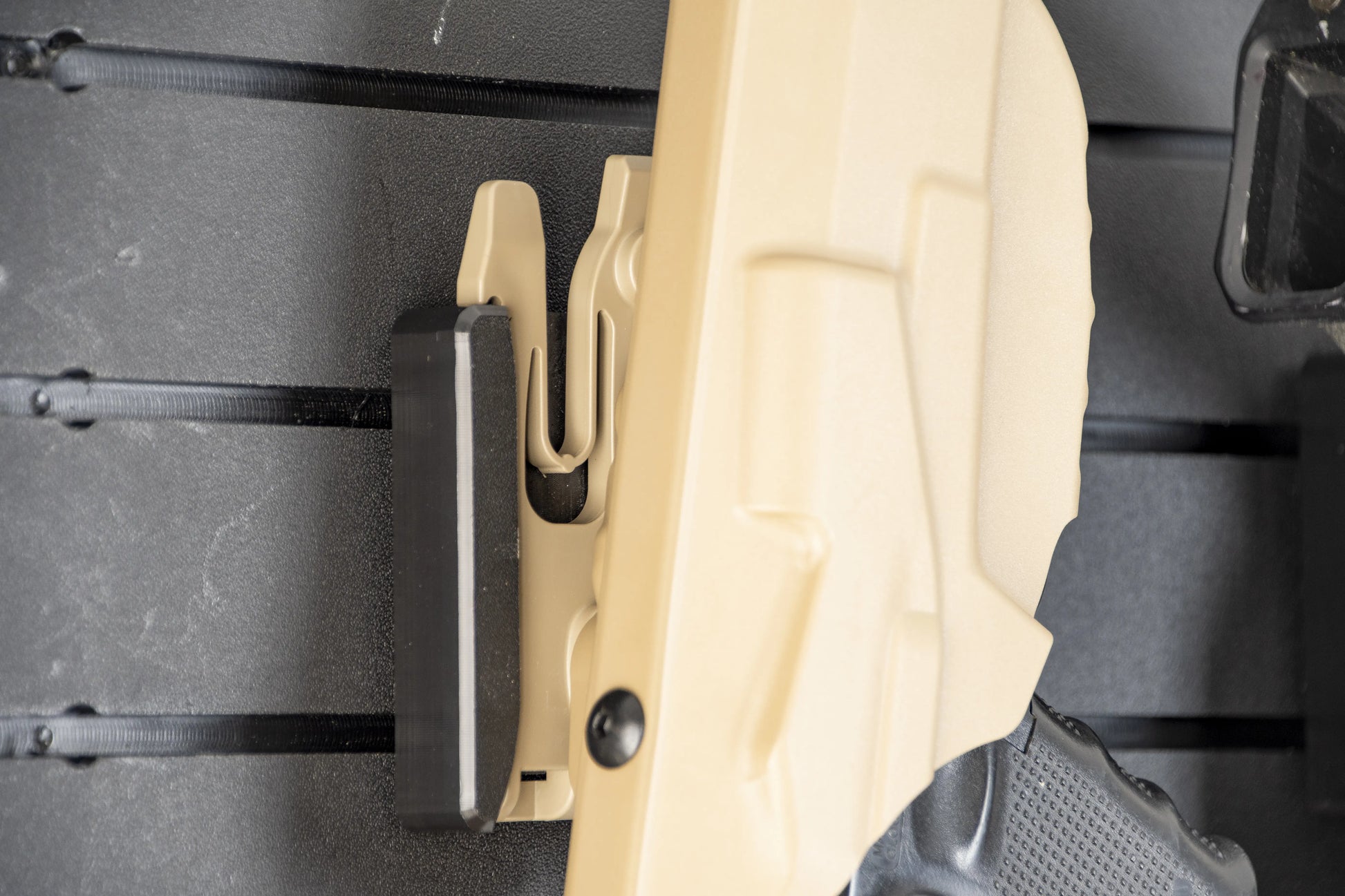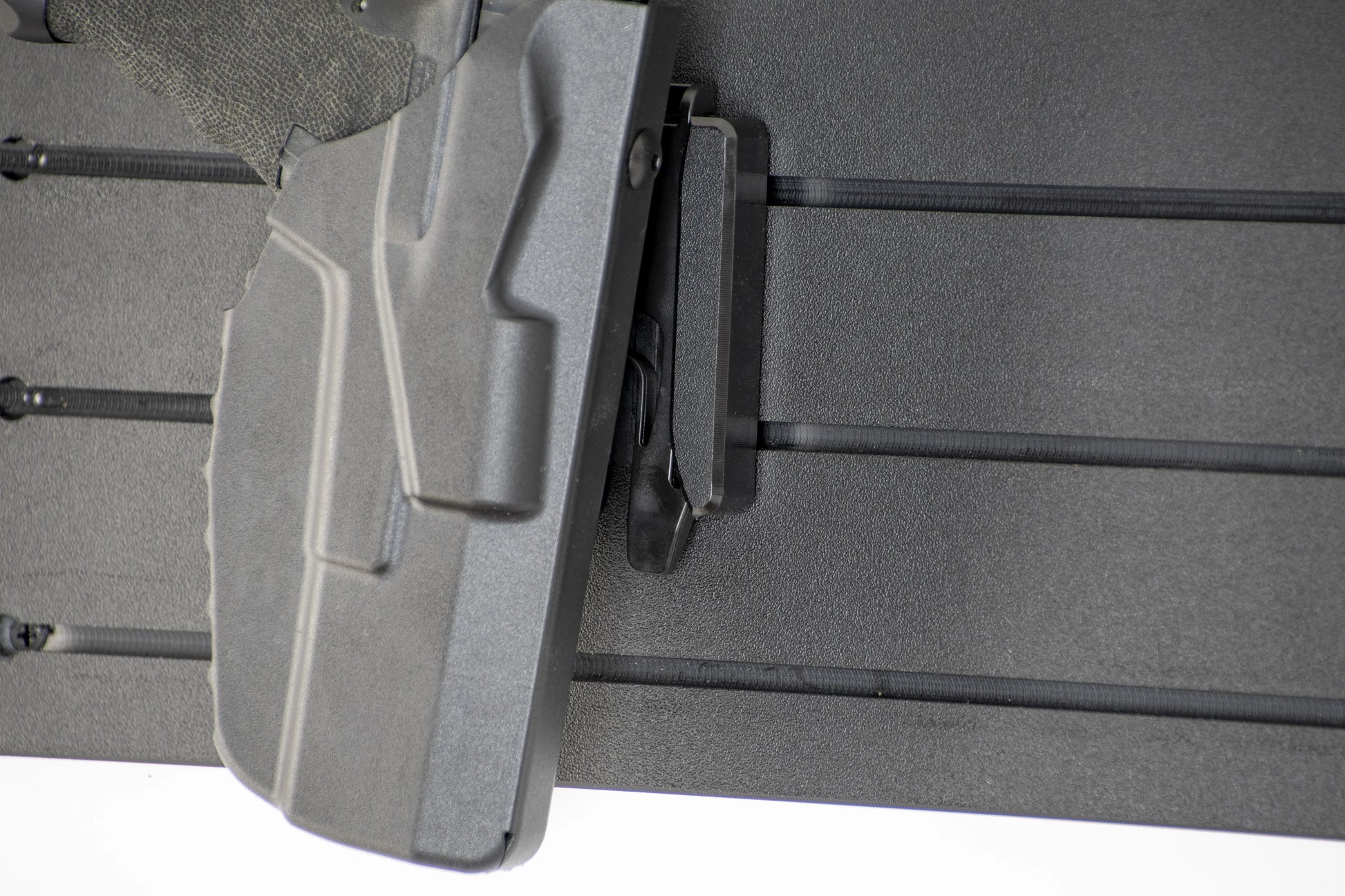 The ModWall QLS Holster Mount is designed specifically for holsters that use the Quick Lock System. There are (4) multiple ways you can use this QLS Holster Mount on our ModWall system.
